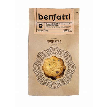 Biscotti bio Monastra in confezione da 320g. Golosi e croccanti biscotti con farina di farro e cioccolato fondente bio. Ricchi di vitamine e fibre, sono irresistibili se inzuppati nel latte.