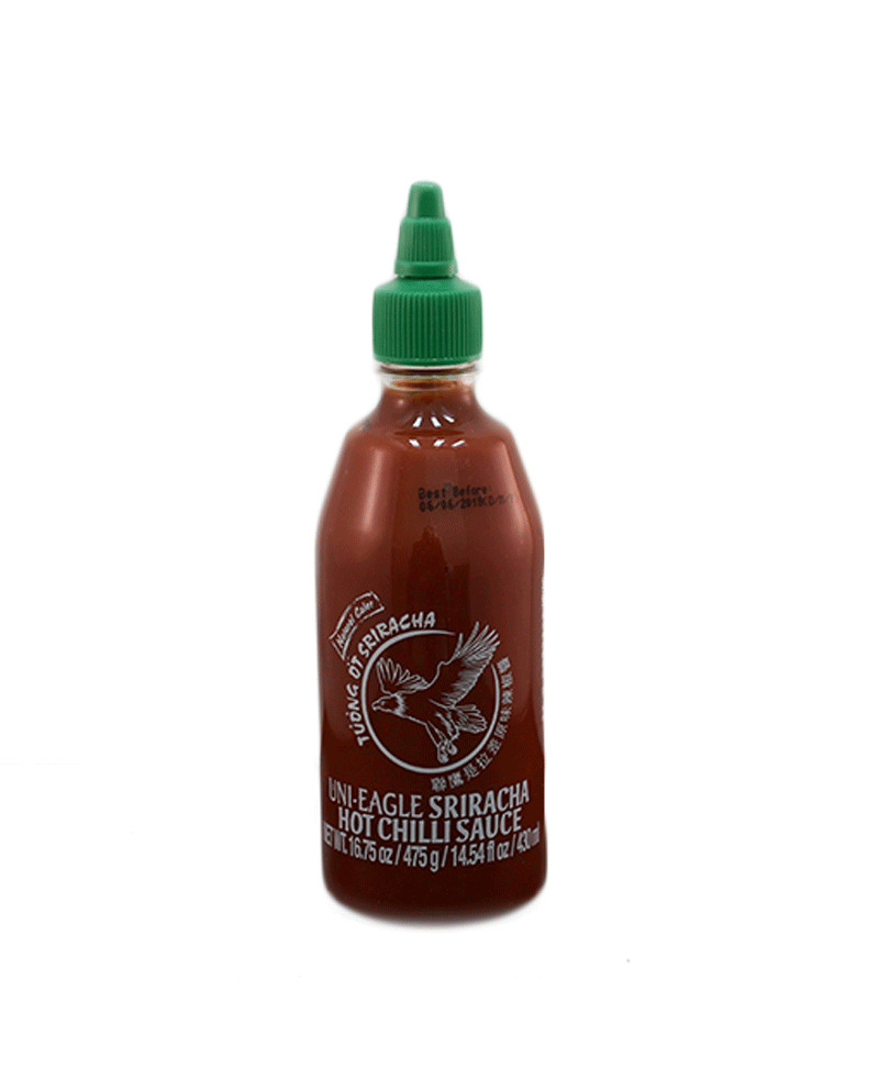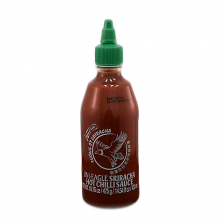 Salsa chili Sriracha uni-eagle in bottiglietta da 475g. Tipica salsa thailandese a base di peperoncini rossi, aromatizzata al coriandolo.